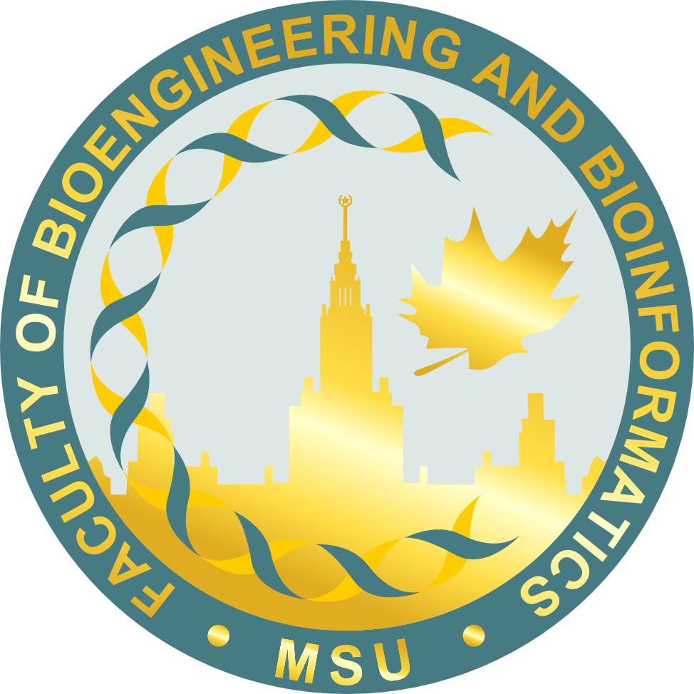 Faculty of Bioengeneering and Bioinformatics logo in png format with gold colored text in english.